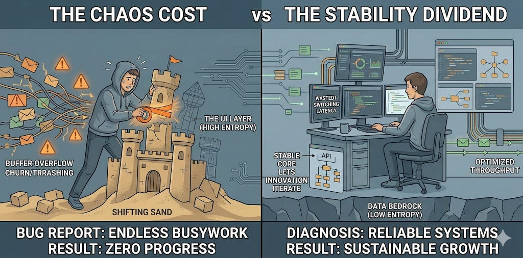 A product team might spend a year rebuilding internal engines to prepare for some hypothetical future traffic, chasing a new buzzword. Meanwhile, current customers are stuck with bugs. New features ship slowly, if at all. Every “improvement” to the engine creates new problems elsewhere, breaking things that used to work. Everyone is exhausted, but the business isn’t moving forward. This is waste, not innovation. It is a failure to identify and protect the things that should rarely change.